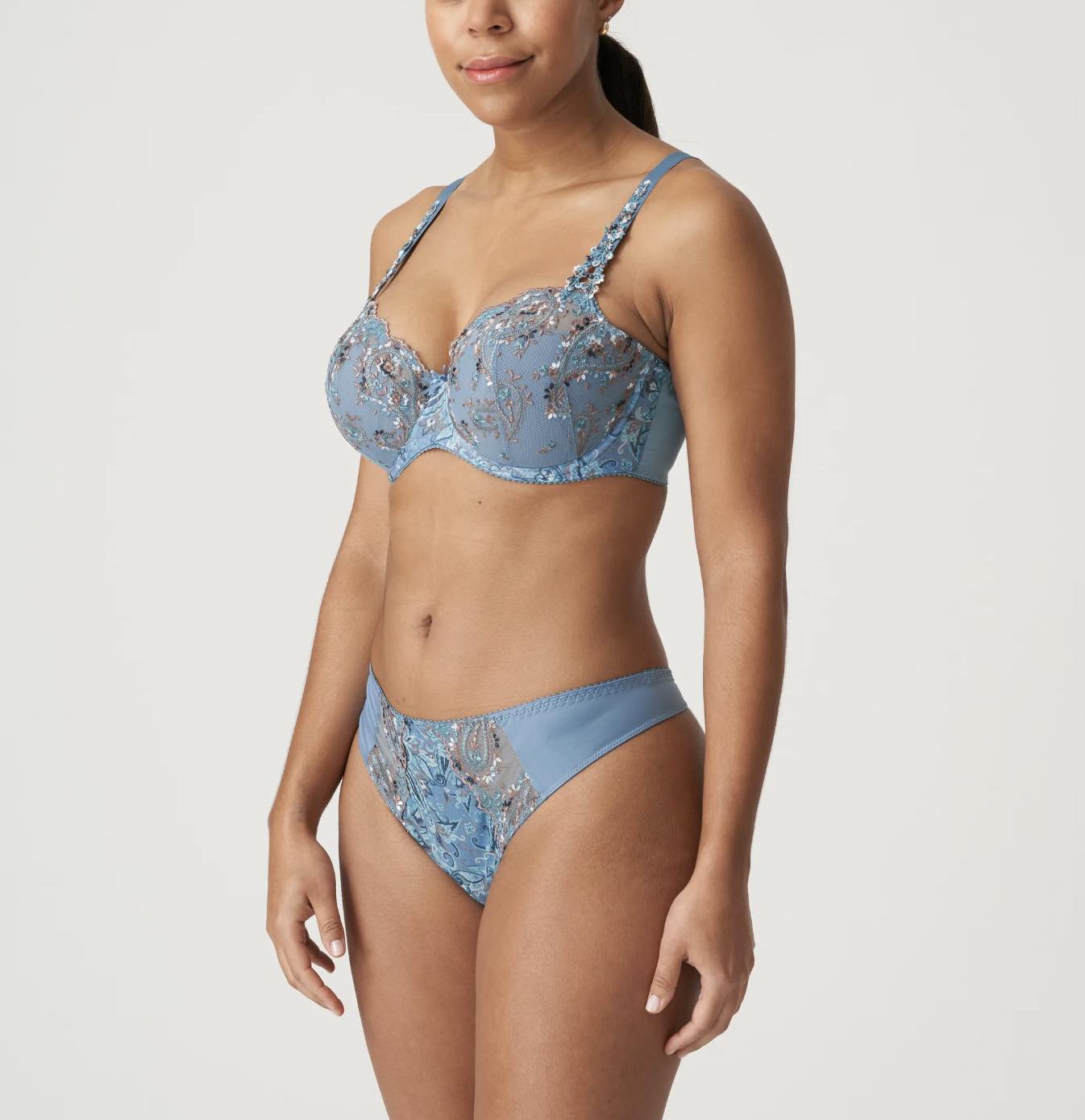 Look and feel amazing in the timeless Alalia Thong that offers signature thong style minimal rear coverage and high-gloss embroidery for a luxurious feminine finish. The semi-sheer voile panelled design adds a subtle flirty detail. Matching lingerie is available from the premium Alalia collection by Primadonna.
