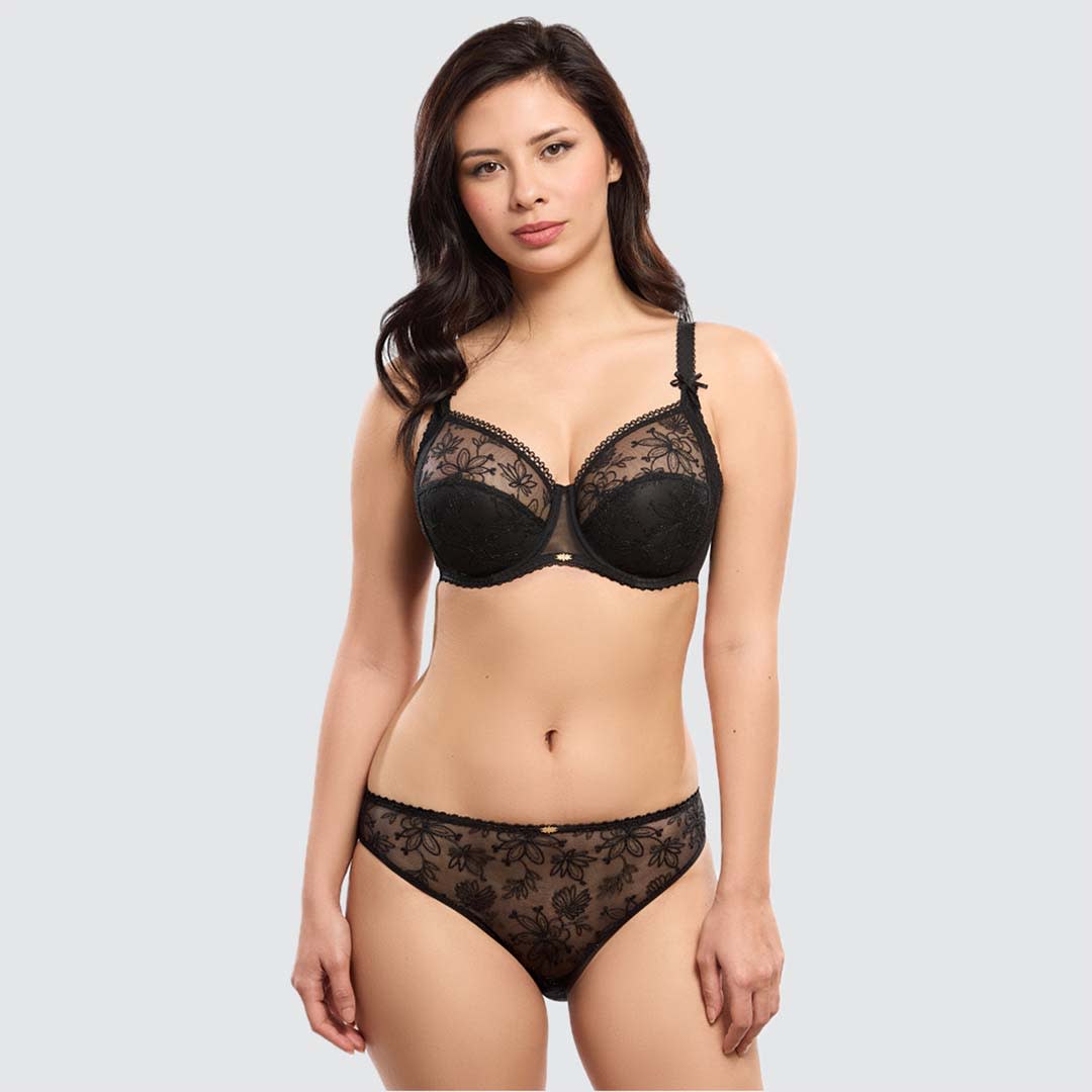 The Alix Underwired Bra features a full-cup shape with semi-opaque side inserts and non-padded cups for natural support and comfort. Decorative adjustable straps and a delicate jewel detail add a touch of elegance. The Alix collection exudes a soft, modern style, combining a delicate floral pattern with subtle hints of sparkle—a perfect blend of romantic seduction and unmatched comfort.