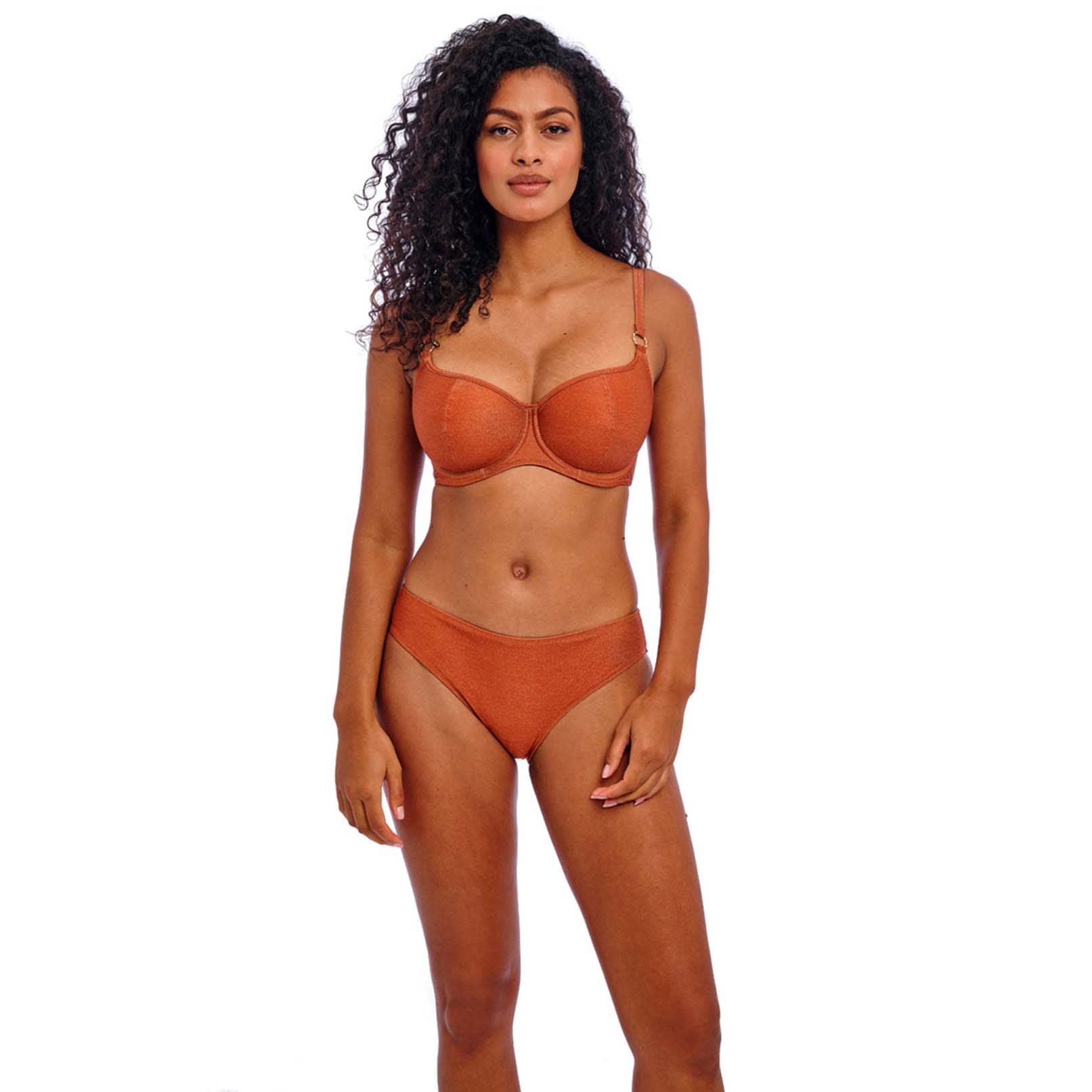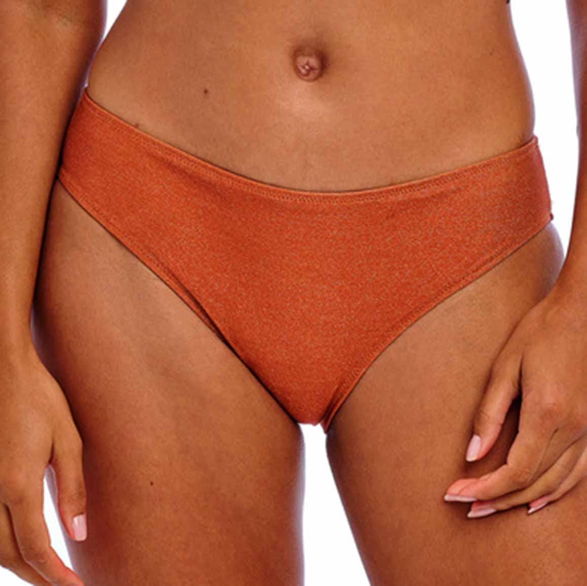 Find your perfect beach day essential with the Arizona Wave Bikini Brief. Designed to sit comfortably on the hips with a flattering cut around the leg and good bottom coverage. The fabric also features subtle metallic gold yarns for a hint of style.