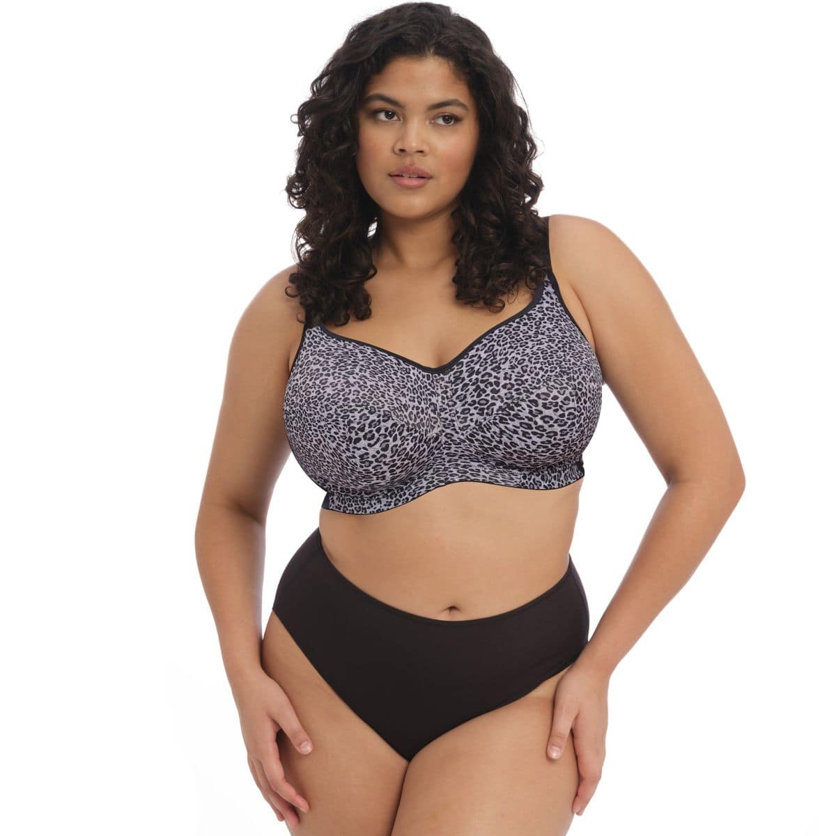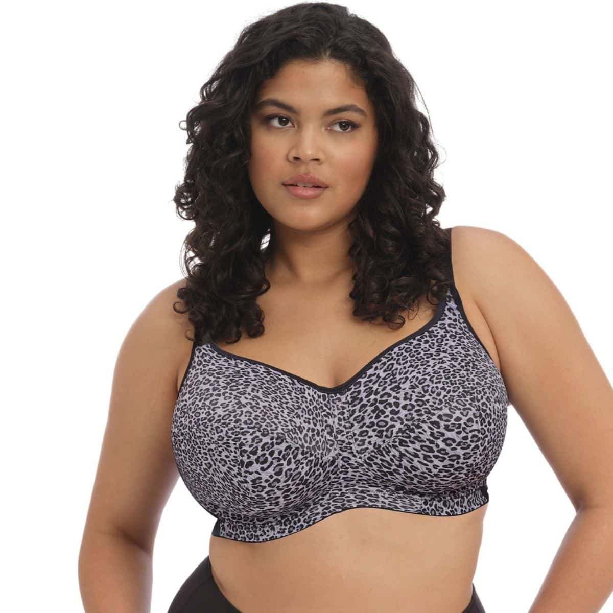 Celeste Soft Cup Bra Gray Leopard provides support all the way up to K cup with no wires or side boning. This is made possible with an internal foam sling that sits in the cup as well as an elasticated under band for a secure yet comfortable fit.