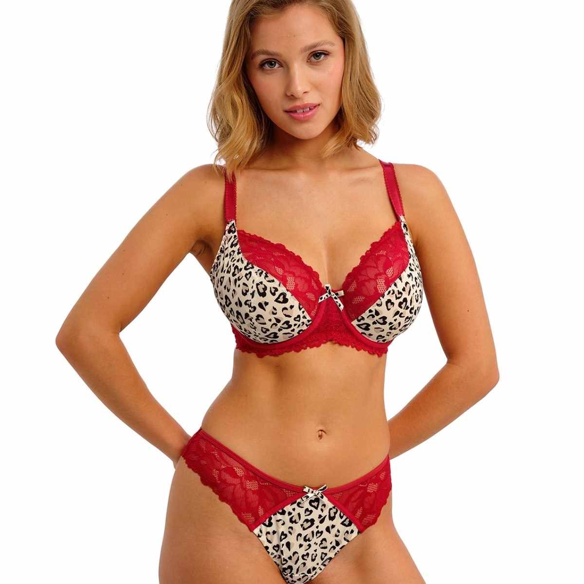 Unleash your wild side with the all-new Cherish Me by Freya. Designed to make a statement, this bold style features an abstract print and is finished with flirty stretch lace across the top cup and cradle. The low centre front creates a plunging neckline without added push-up, giving you natural lift and a confident silhouette. Supportive plain powernet wings offer firm anchorage, while fully adjustable straps ensure a secure fit with no slippage. Finished with a playful printed leopard bow at the centre front, Cherish Me is your go-to for fearless femininity and everyday comfort.