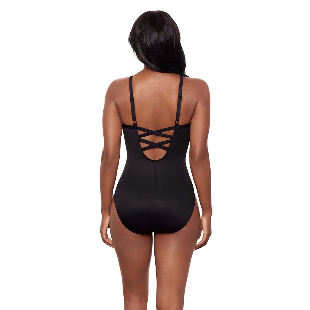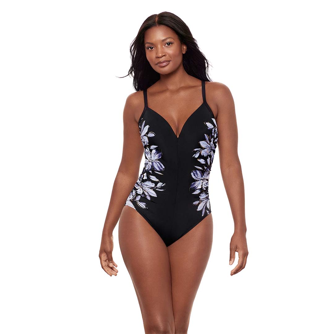 Instantly flatter your figure with this sculpting one-piece Fiore di Luna Temptation Underwired Low Back Shaping Swimsuit, made from Miraclesuit’s exclusive Miratex fabric for triple the shaping power. Designed to smooth and define, it features a V-neckline with waist-accentuating shirring, moulded underwire cups for support, and a low scoop back with criss-cross detail for a touch of allure. Finished with a floral print and metallic accents for a stylish finish.