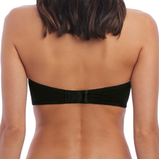 Halo Lace Strapless Bra has an elastic band that runs along the top of the bra, and has intermittent slots for the straps that allow for a variety of positions and wearing configurations.