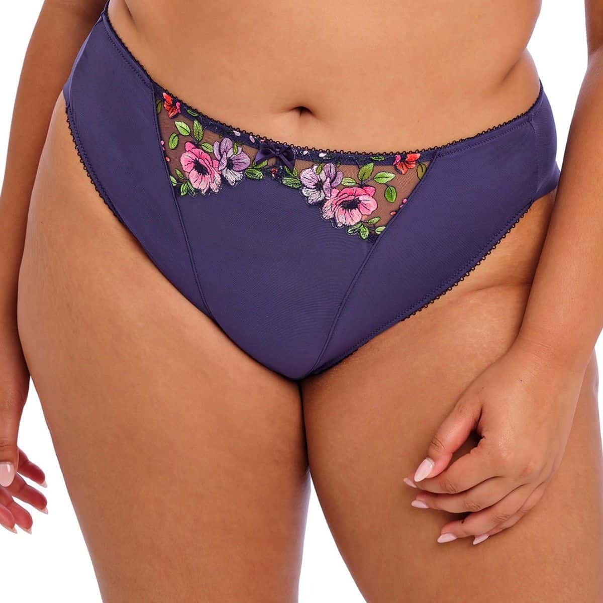 Folded edge back leg panel for a smooth no-show leg edge. Precision printed embroidered front panels. Double layer stretch mesh front and back for modest
