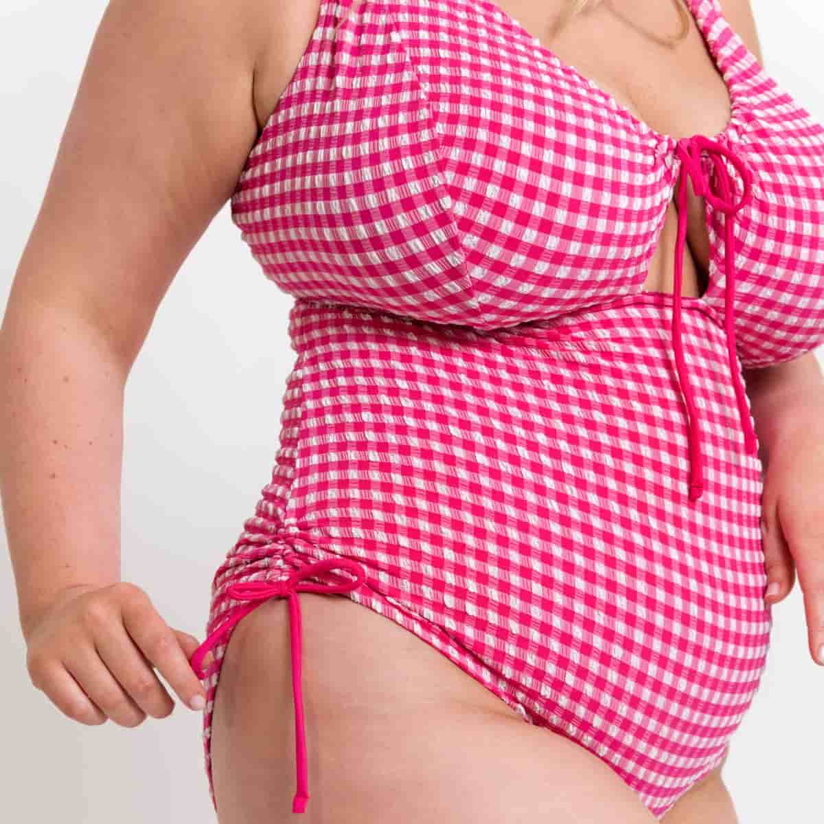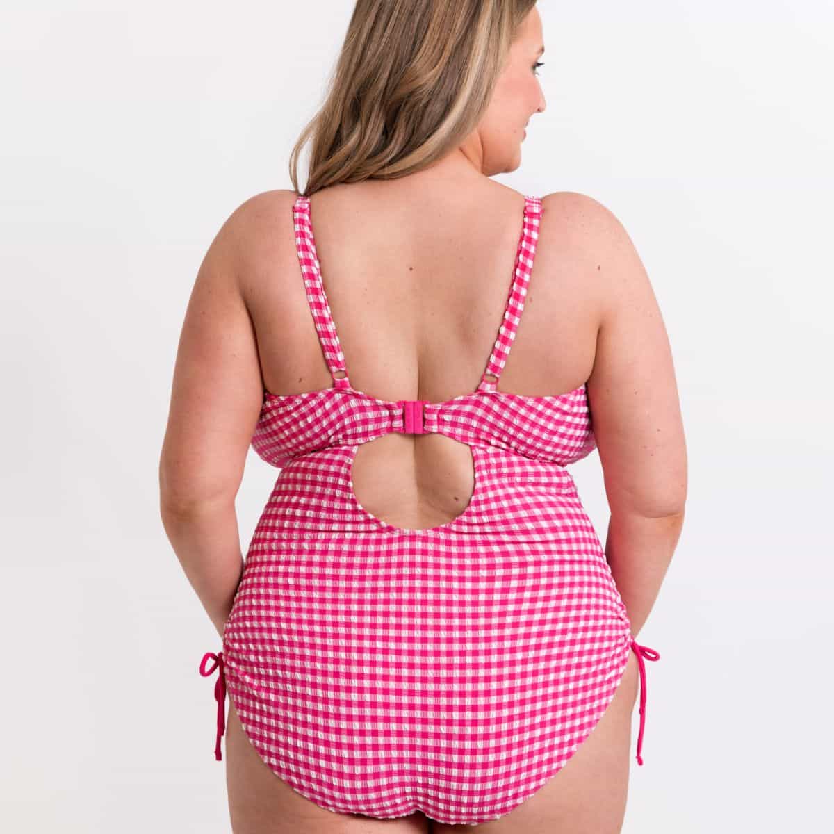 A dry-touch crinkled gingham swim fabric. Non-wired non-padded fully lined stretch fit swimsuit for support and comfort with tie adjustability.