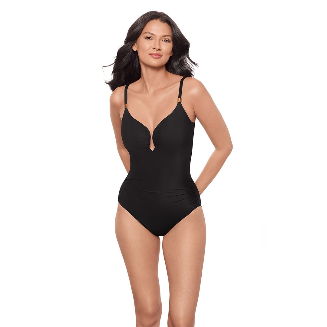 Turn heads with this curve-enhancing one-piece Razzle Dazzle Antheia UW Shaping Swimsuit, designed to help you look 10 lbs. lighter in just seconds. The plunging U-wire neckline creates a bold, flattering frame for the bust, supported by hidden underwire for a lifted silhouette. Shirring through the midsection smooths and flatters the tummy, while adjustable straps with gold bead accents and a chic scoop back add stylish finishing touches. Moderate leg coverage offers a confident, comfortable fit.